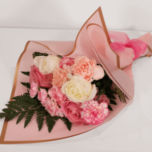 Celebrate her nurturing spirit with our Gentle Grace bouquet — a soft and soothing mix of ivory roses, blush pink carnations, and peach blooms, all wrapped in a pastel pink sheet with a golden trim.